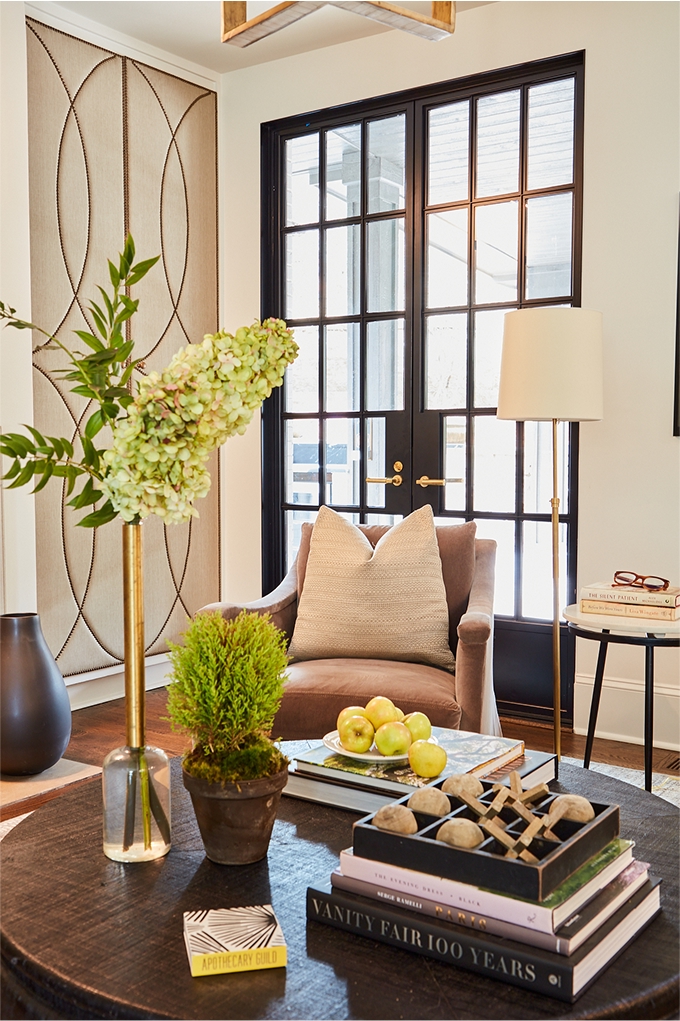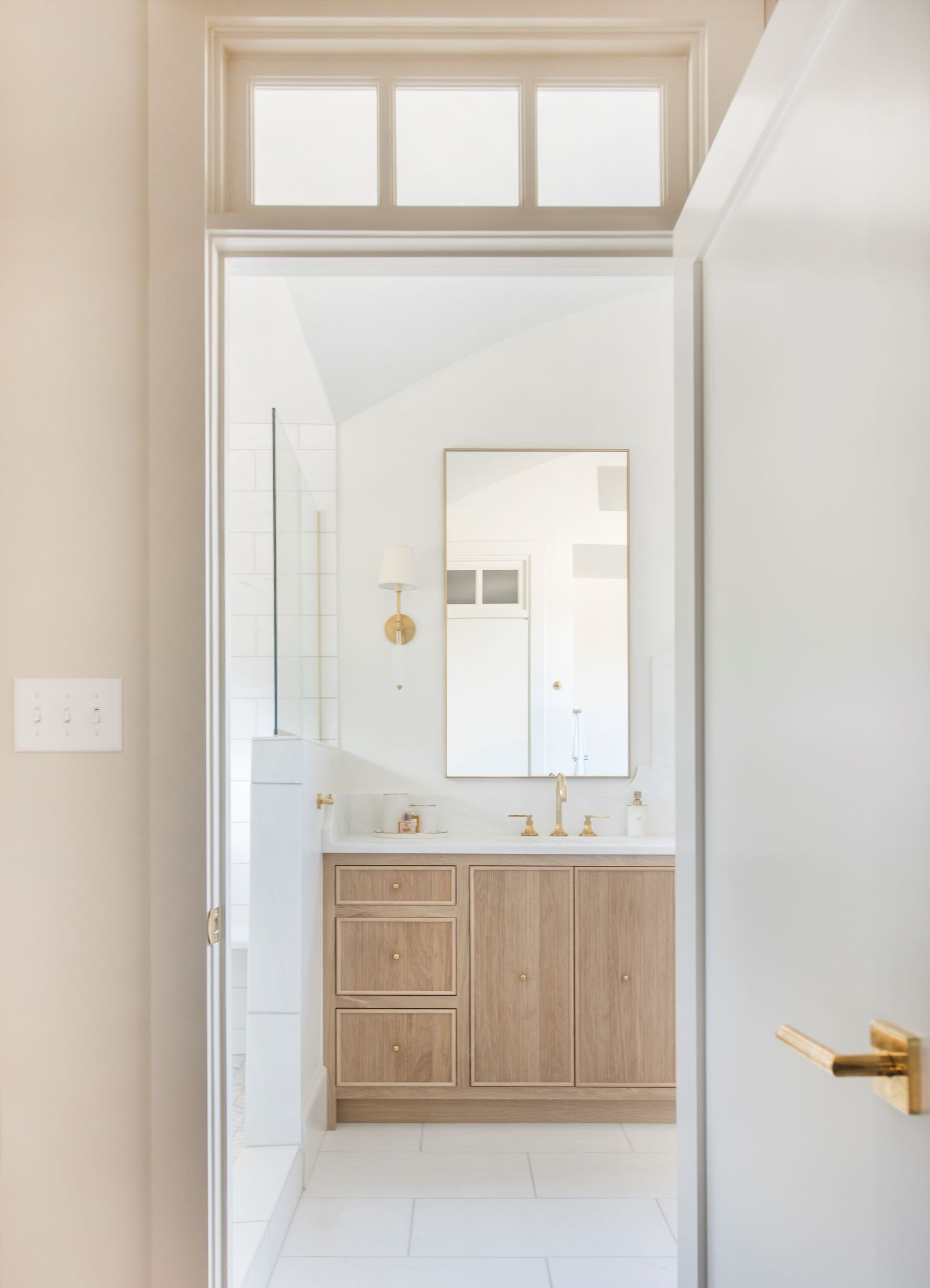 One of the first things we did was add a new large window to the center of the bathroom. This one simple change made a huge impact on the look and feel of the entire space. Now daylight pours into the bathroom, and fills every corner, and the homeowners are able to enjoy outside treetop views of their front yard. The daylight bounces off the new barrel vault ceiling that was installed to accentuate the height of this narrow space and take advantage of unused attic space above. The light is allowed to travel through the newly added transoms installed over the new bathroom doors and into the once dark and closed off primary closets. We partnered with a local architect who advised on the placement of the window, to ensure the balance to the front of the house.