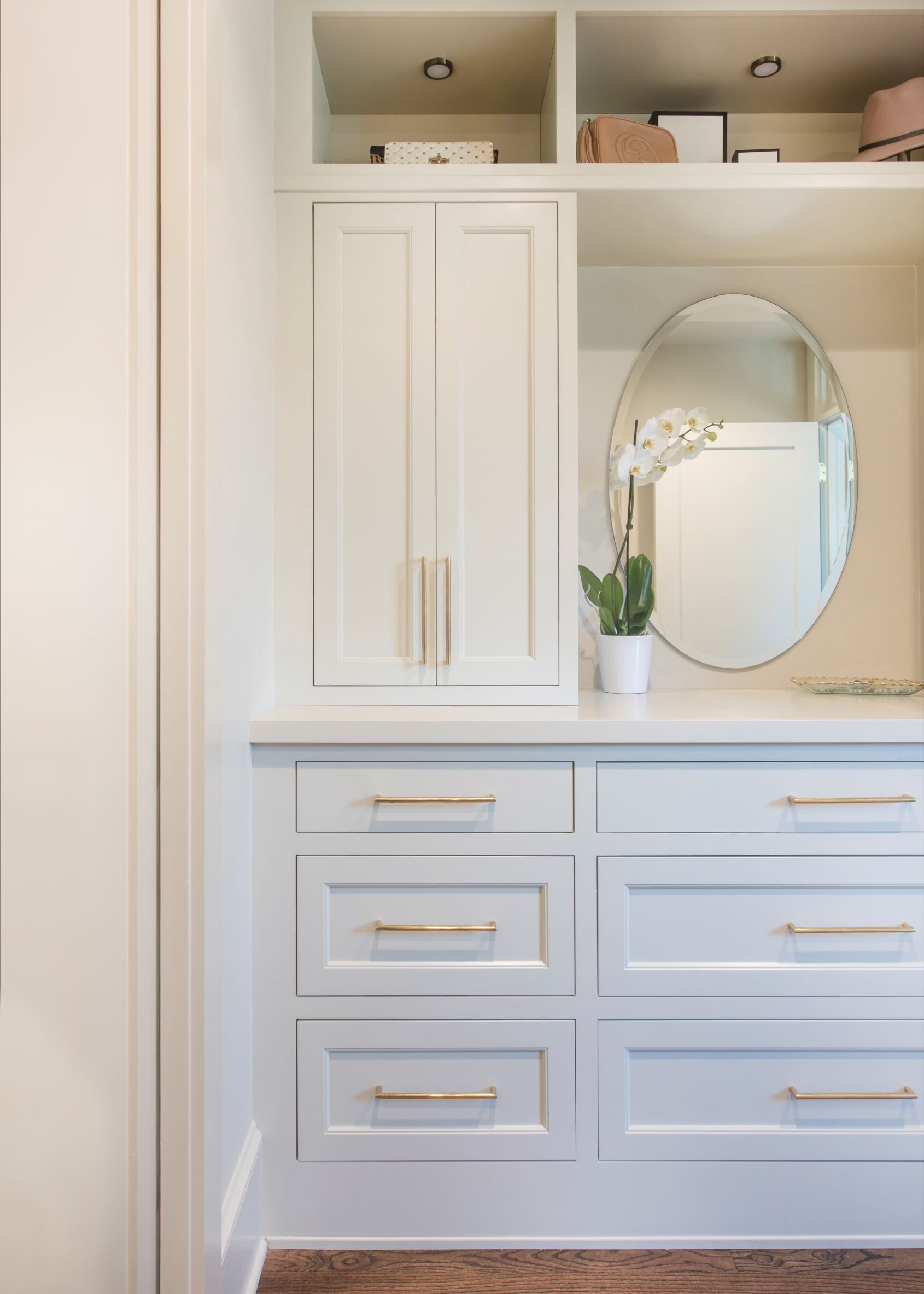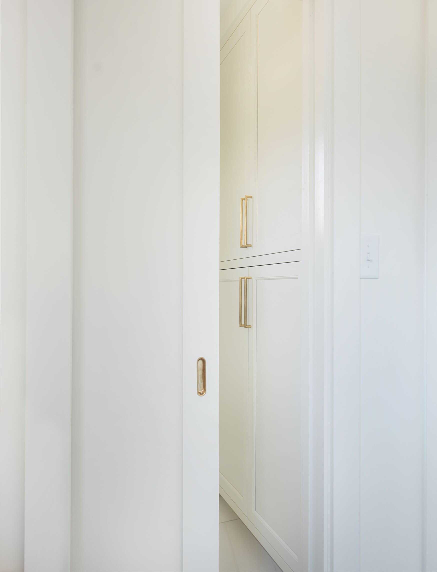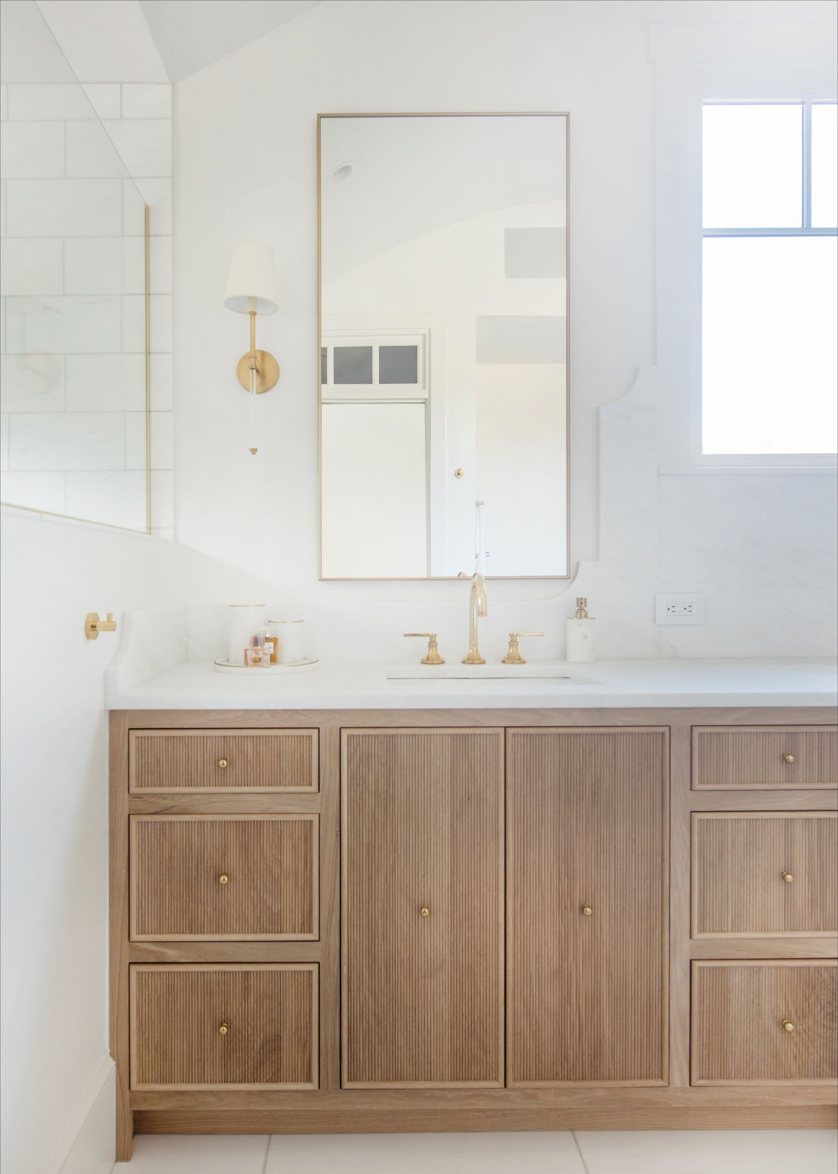 Custom reeded white oak cabinetry was expertly crafted to the homeowners exact specifications. Careful planning went into finding a storage space for everything in this primary suite. A shallow cabinet was built into the toilet room to utilize every square inch of space and tuck away all necessities. A living unlacquered brass finish was selected for all of the hardware and plumbing fixtures to give the bathroom a warm and natural quality.