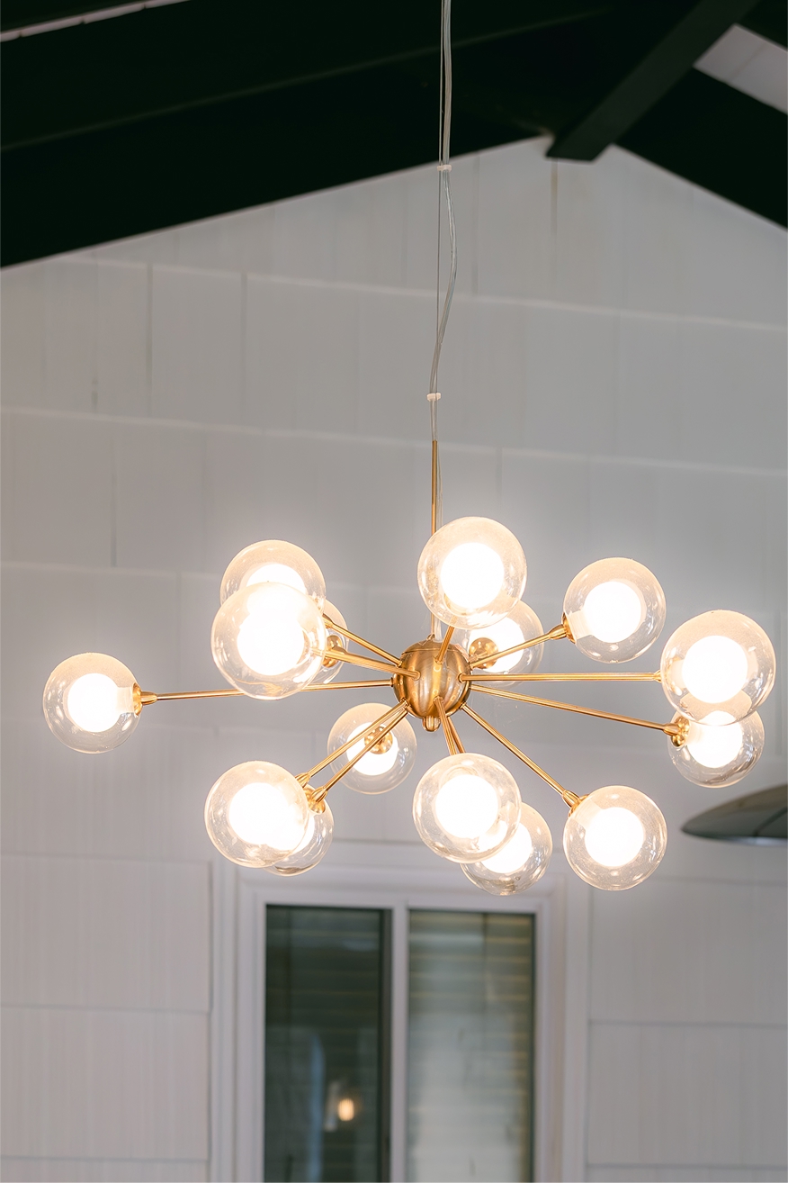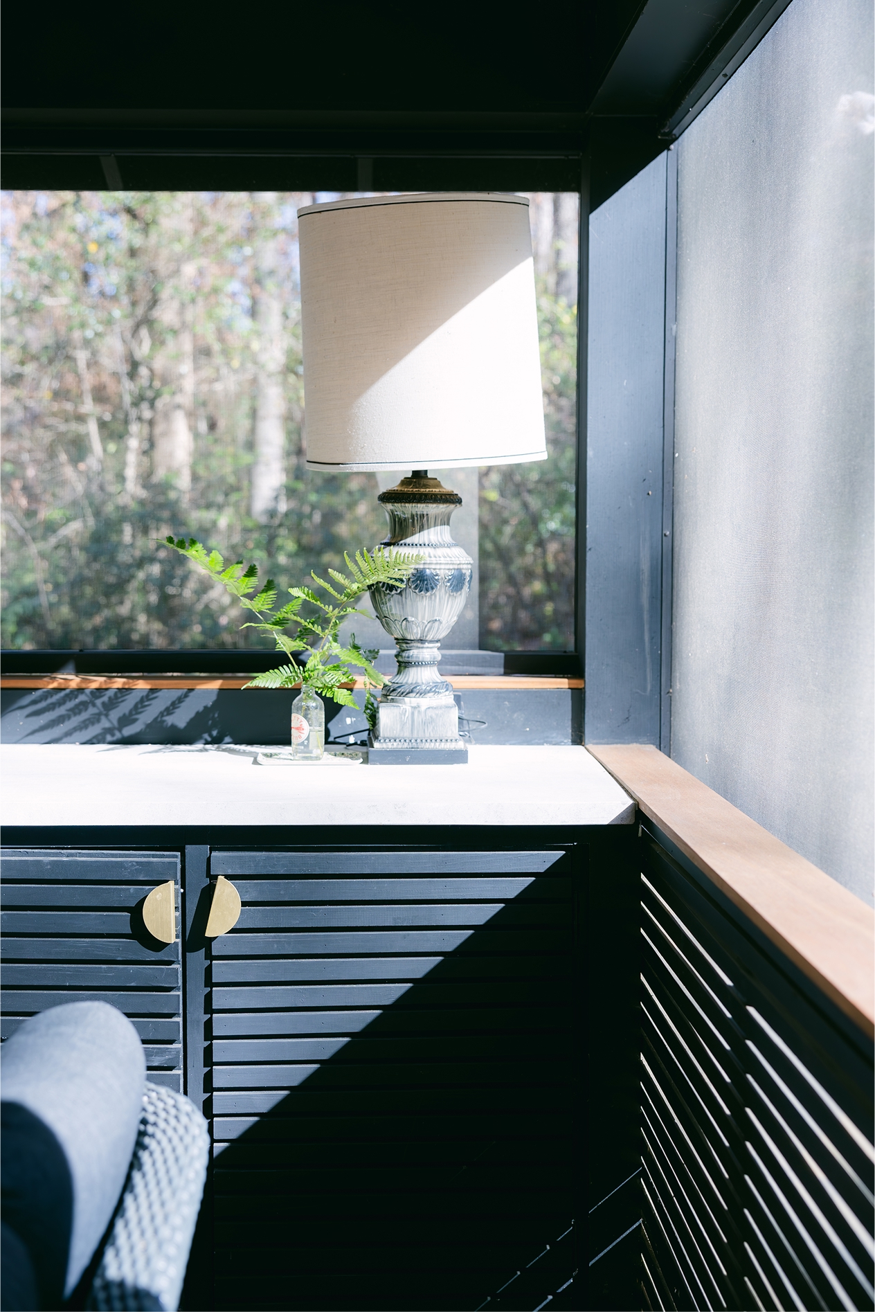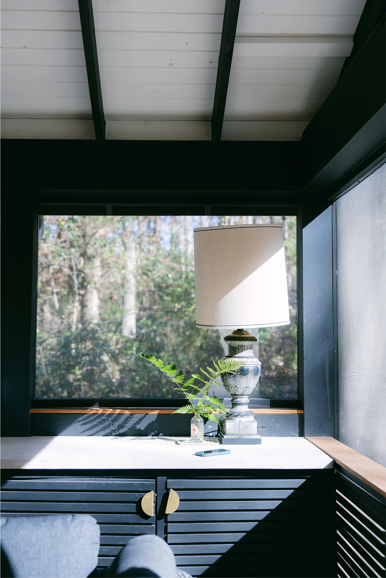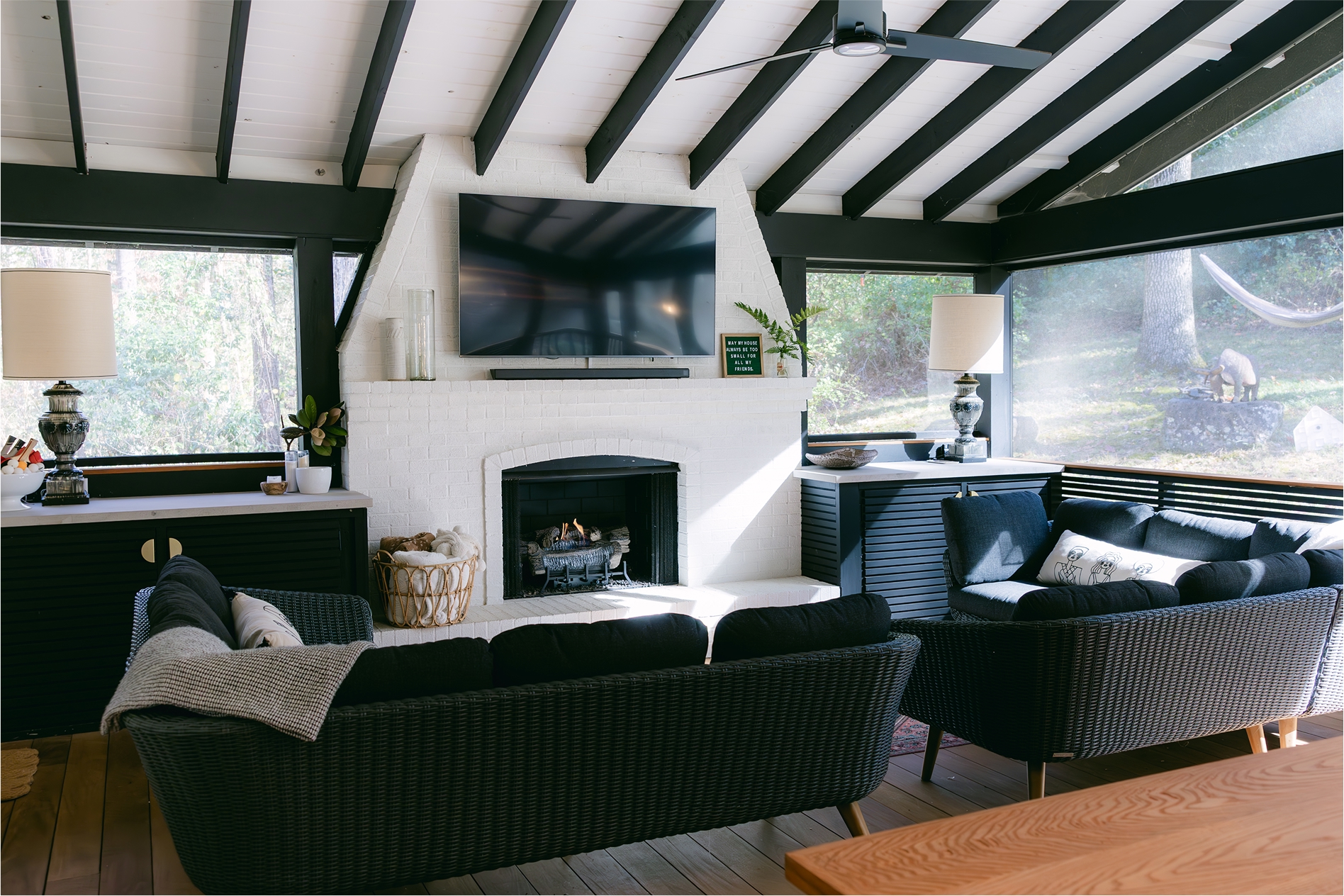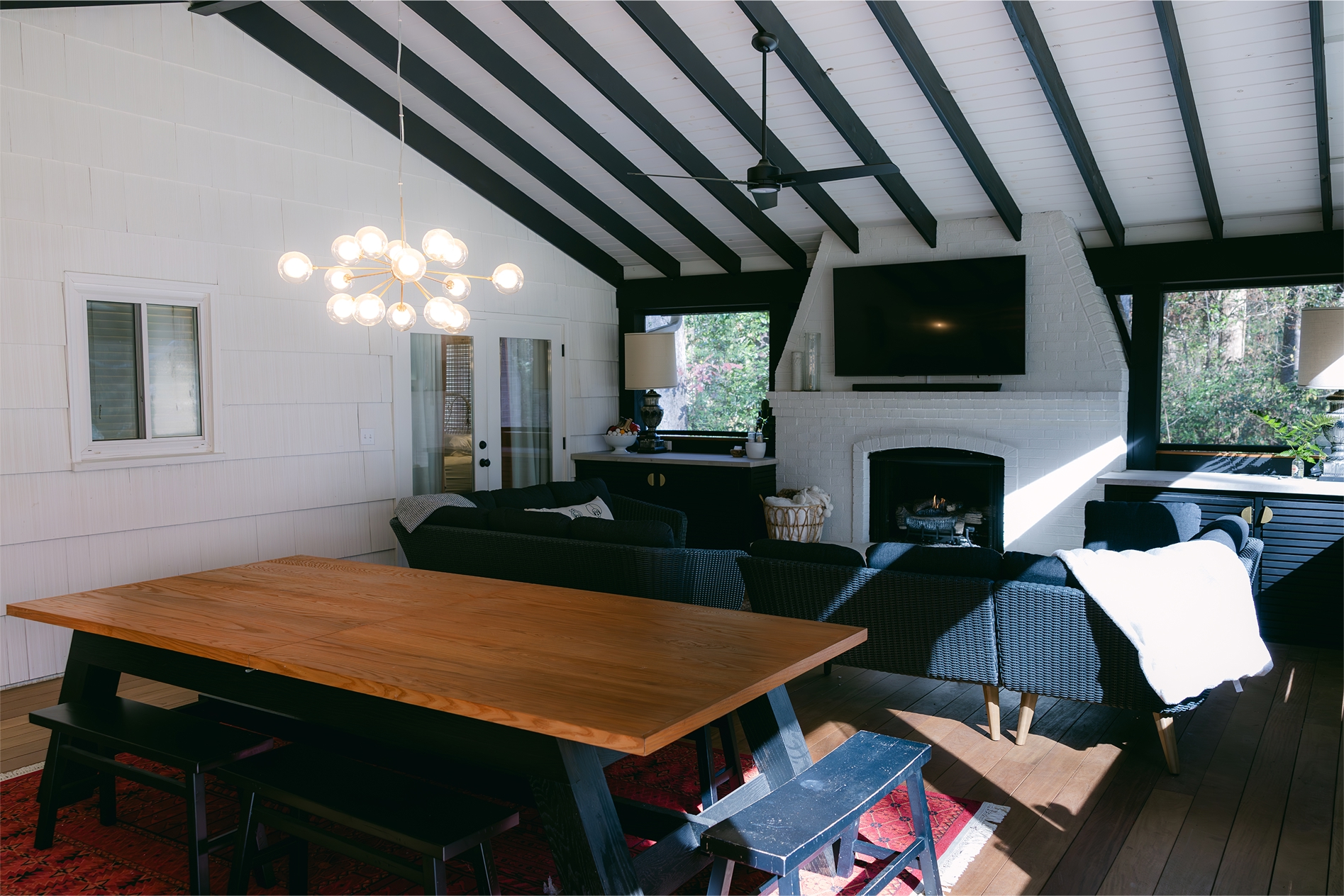 Exposed rafters with tongue and groove decking were painted in a crisp and classic black and white palette. Oversized screen systems maintain the full views out to the wooded backyard. A custom, narrow handrail detail speaks to the clean, crisp lines of the house. Replacing the primary bedroom windows with new french doors directly onto the porch created a shortcut to the kitchen. Lastly, install of elegant and modern lighting, couches, and rugs helped pull it all together, turning this screen porch into an outdoor living room with all the comforts of home.