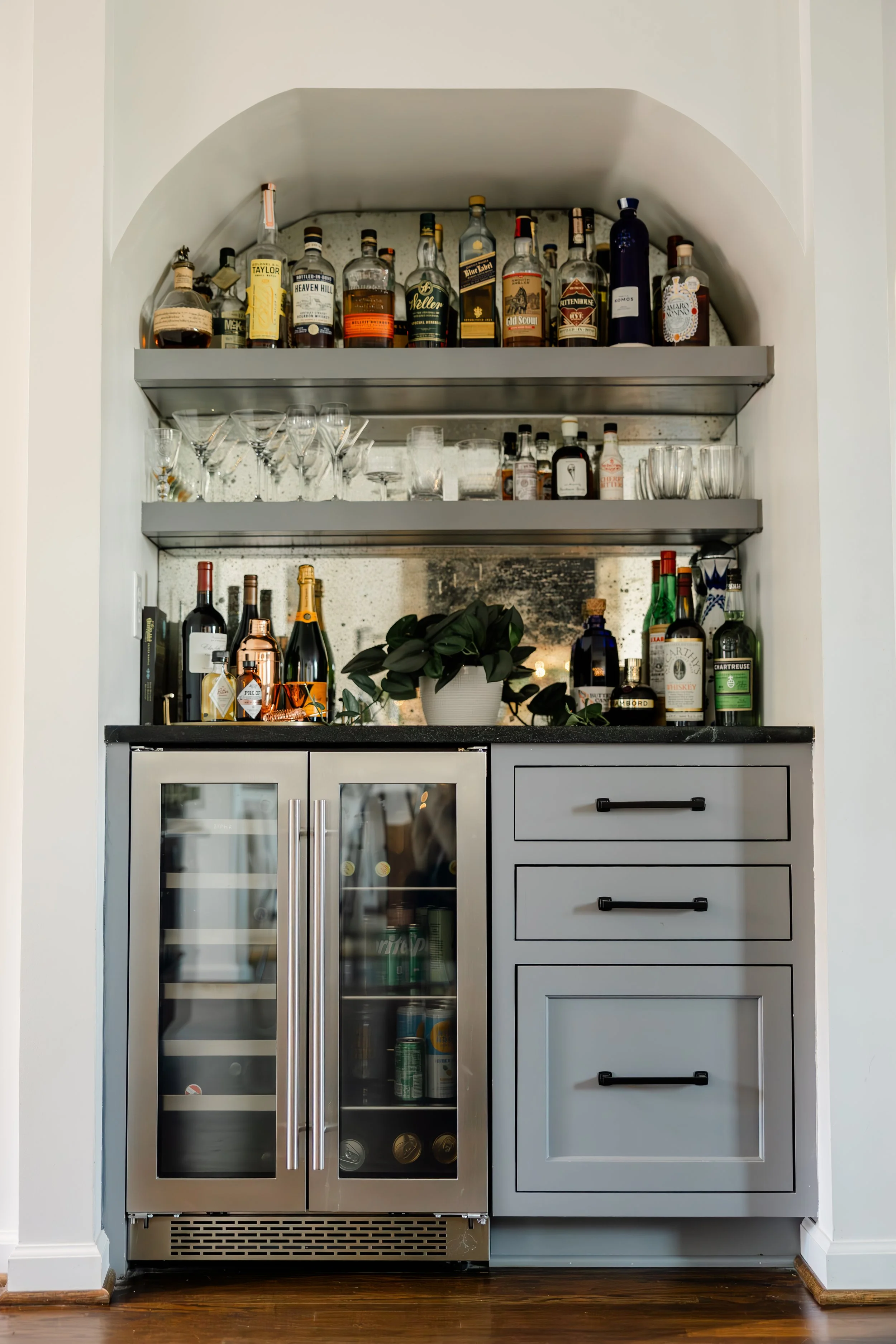 The bar—now a showpiece in the home—features floating shelves, an antiqued mirror backsplash, and an under-counter wine cooler and beverage fridge. This Mountain Brook kitchen renovation and bar addition is a prime example of high-end design-build execution tailored to modern living.