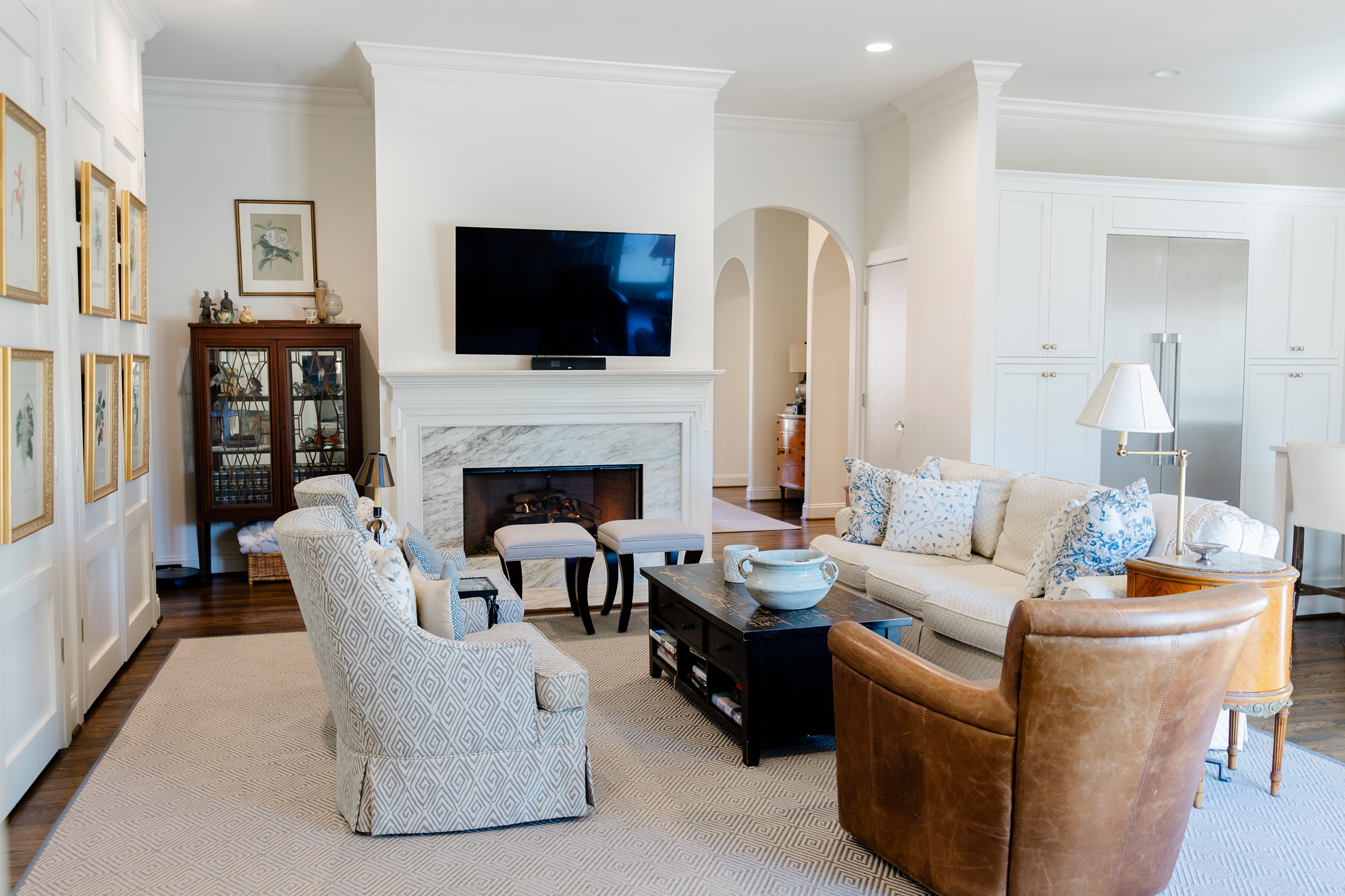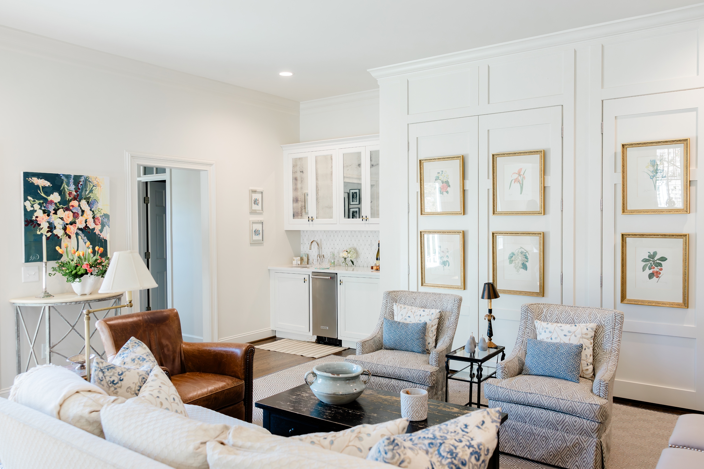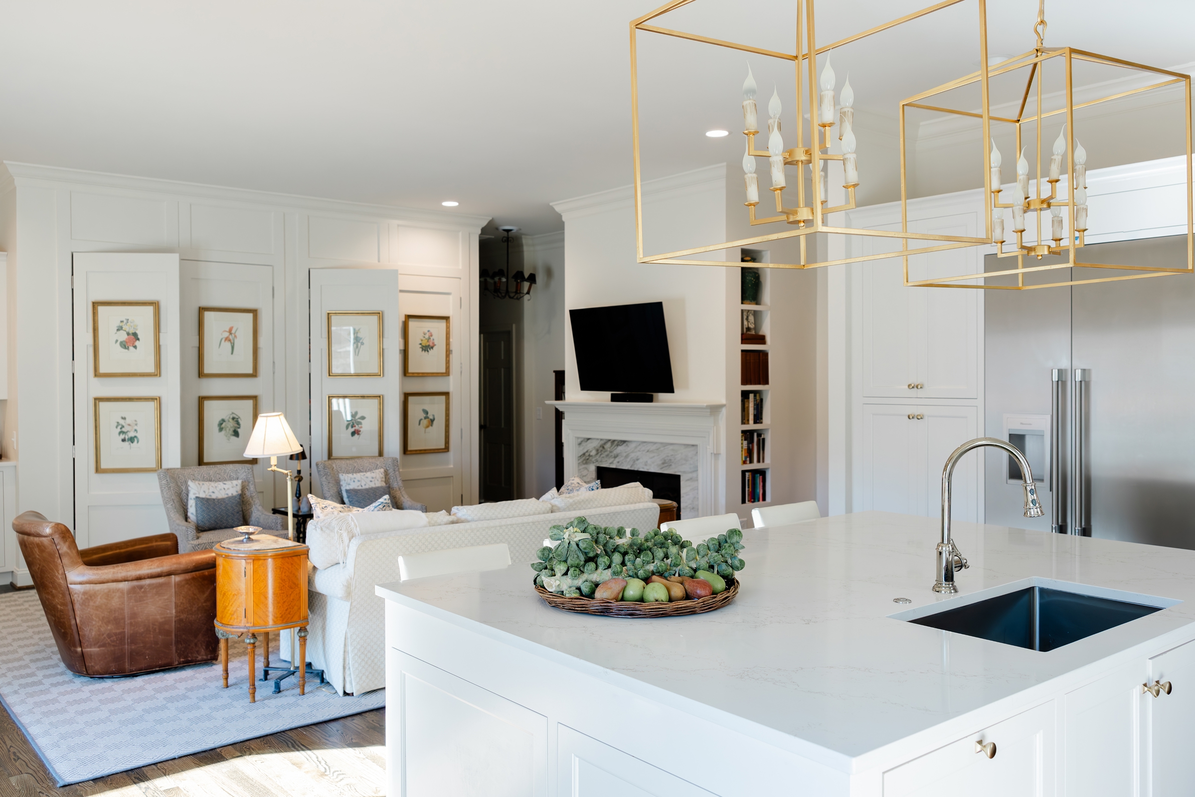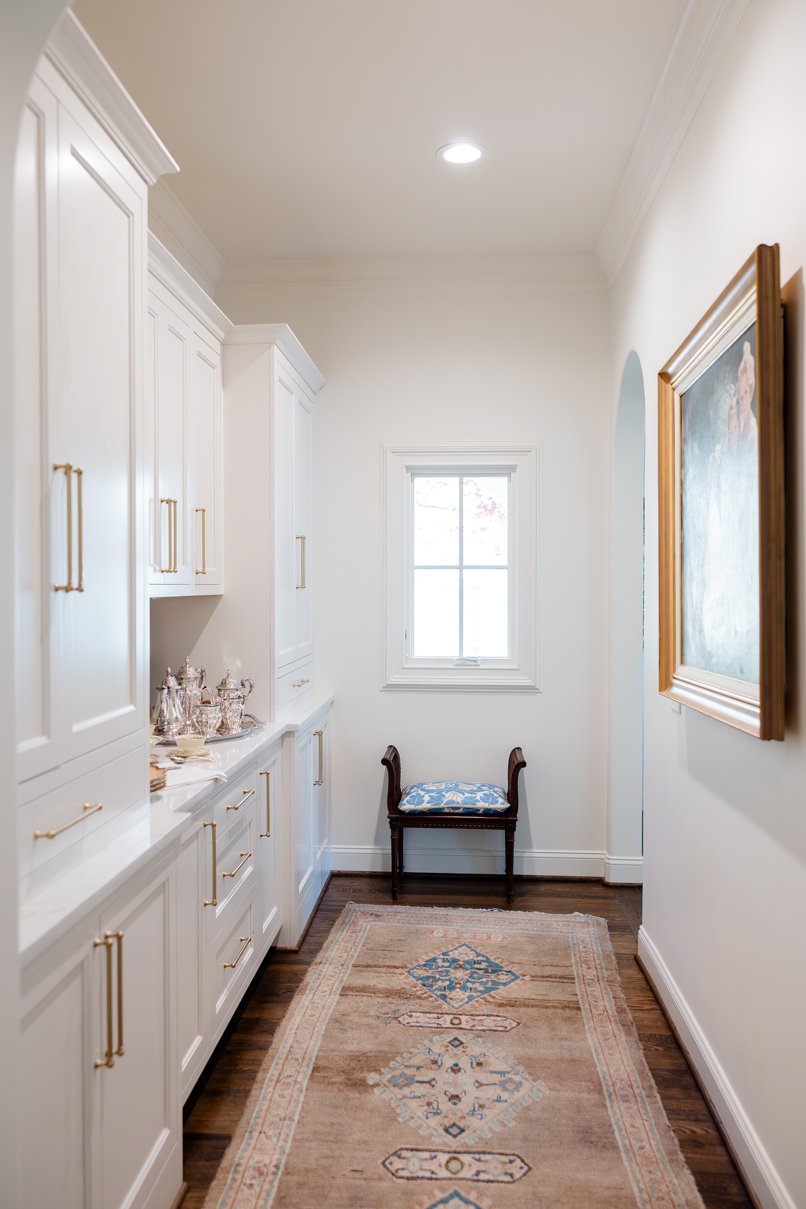 The new layout allowed for an open kitchen to living room, a new butler’s pantry, a wet bar, and most invaluable to the homeowners lots of built-in ‘hidden’ closets in multiple locations. Full custom inset cabinets, sereno gold quartz countertops, a full-height stone backsplash with decorative detailing, and a coffee bar inside a counter-set cabinet highlight the kitchen. The wet bar houses a simple drink station with an under counter ice maker, diamond-pattern marble tile backsplash, and antique mirror upper cabinet doors.