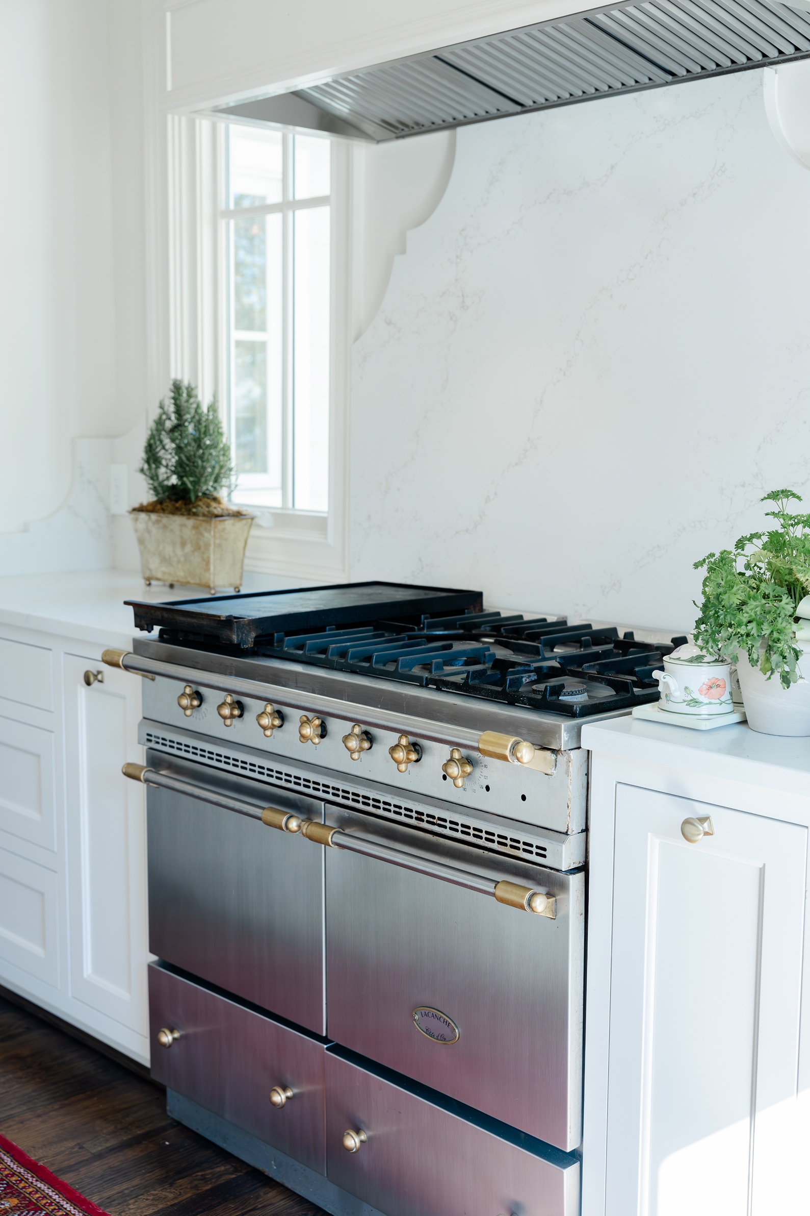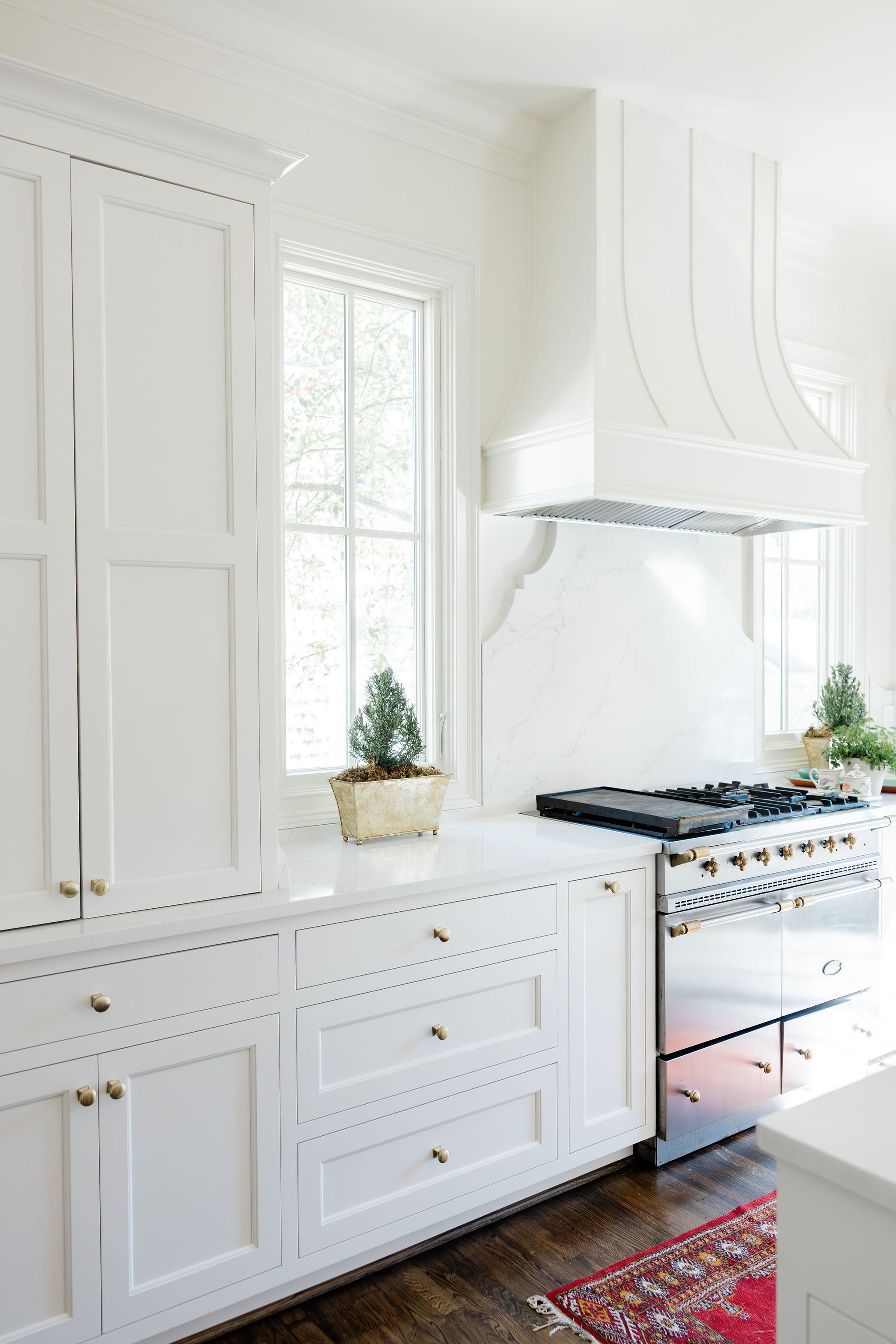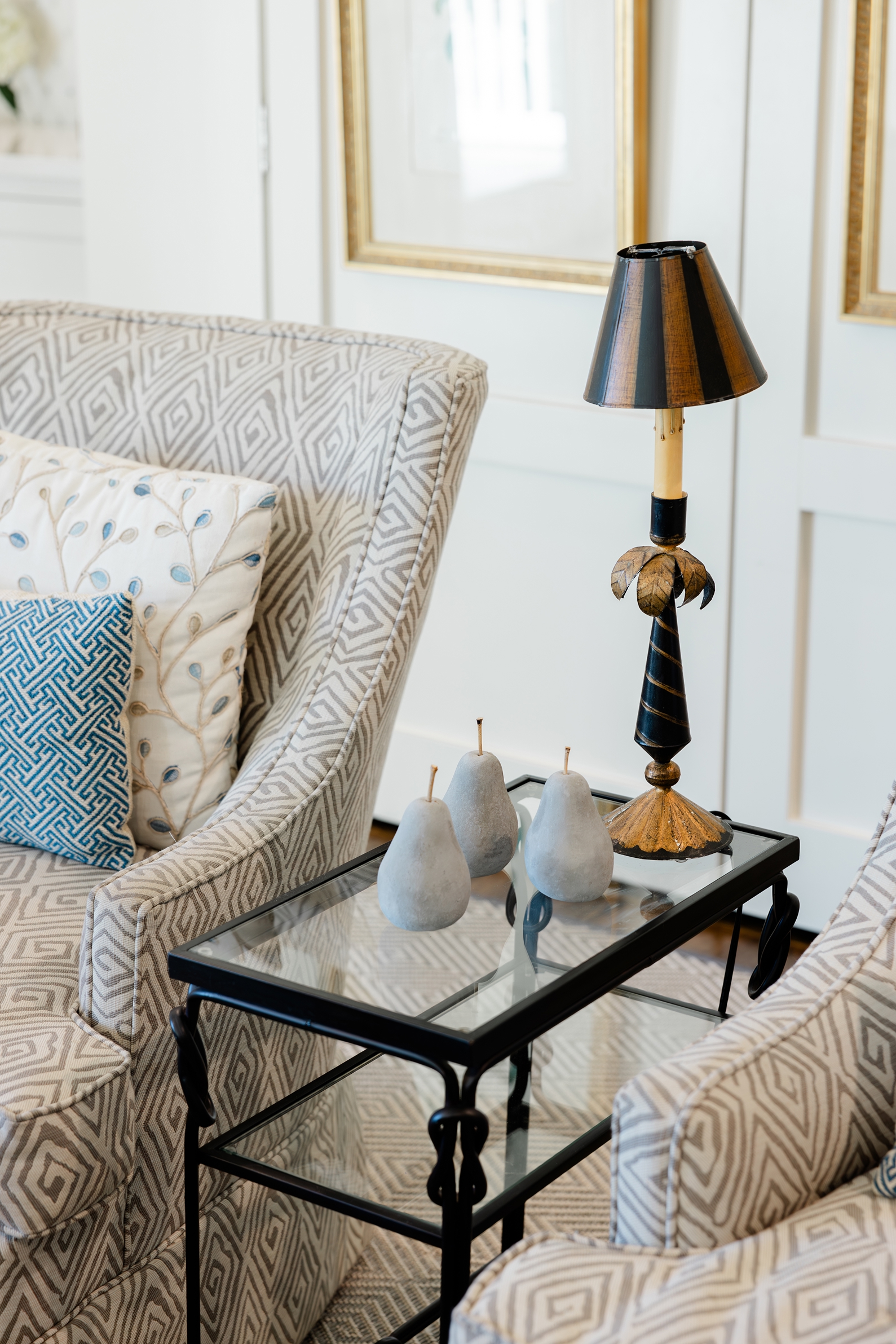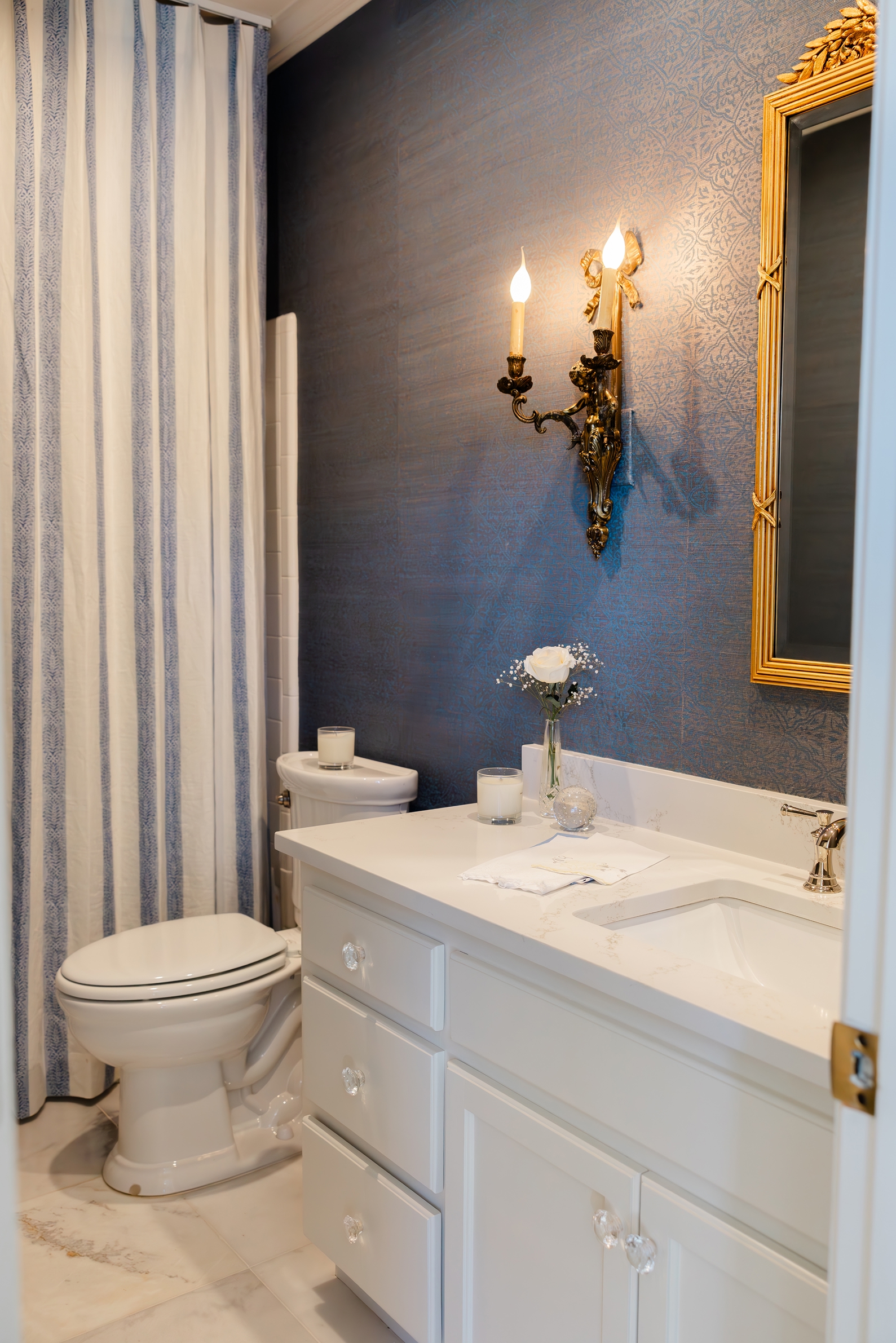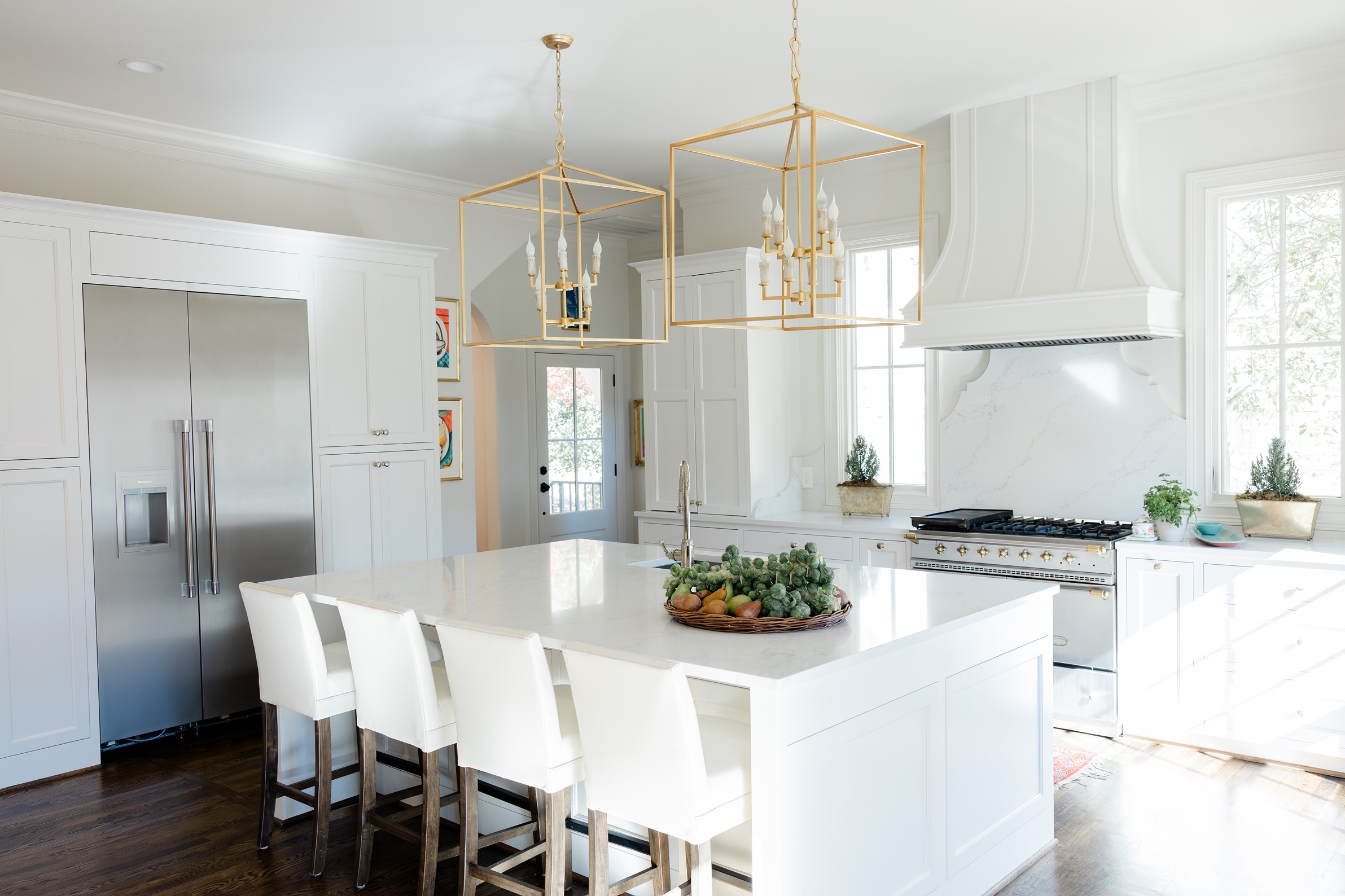 The new layout allowed for an open kitchen to living room, a new butler’s pantry, a wet bar, and most invaluable to the homeowners lots of built-in ‘hidden’ closets in multiple locations. Full custom inset cabinets, sereno gold quartz countertops, a full-height stone backsplash with decorative detailing, and a coffee bar inside a counter-set cabinet highlight the kitchen. The wet bar houses a simple drink station with an under counter ice maker, diamond-pattern marble tile backsplash, and antique mirror upper cabinet doors.